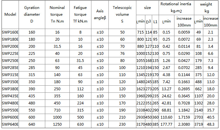 SWP-E universal coupling Features and applications: Bearings are wearing parts. In order to facilitate the replacement of the bearing, the bearing seat gland is made into a split type, bolted, and can work under the condition of β≤5°~10°. Applicable to rolling machinery, lifting and transportation machinery, engineering machinery, mining machinery, petroleum machinery and other heavy machinery, connecting two different axes of shaft drive, can not buffer, reduce vibration. Type A - has a telescopic length; Type B - has a telescopic short type; Type C - no telescopic short type; D type - no telescopic long type; E type - has a telescopic double flange length; F type - large telescopic long type; ZG type - dressing through type FG type--reverse through type ![]() ![]() |