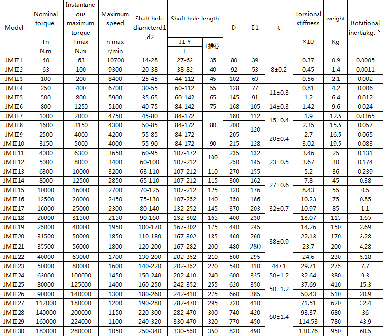 Characteristics and application of JMII diaphragm coupling: Compared with flexible coupling of metal elastic component, it has high mechanical strength, large bearing capacity, light weight, small size, high transmission efficiency and high transmission accuracy, and good reliability. Easy to assemble and disassemble. Suitable for medium, high speed and large torque shaft drive. Compared with the drum-shaped gear coupling, it has no relative sliding, no lubrication, long service life, no noise, simple structure and so on. It can partially replace the drum-shaped toothed auxiliary device. Not affected by temperature and oil. It has the characteristics of acid resistance, alkali resistance and corrosion resistance. It can be used in high temperature, low temperature and working conditions with oil, water and corrosive media. It is suitable for shafting transmission with little change in load of various mechanical devices. It is extremely versatile and has been widely used in industrialized countries. It is a high-performance flexible coupling 重點(diǎn) which is mainly promoted and applied in China. High-precision diaphragm coupling can be used for High speed conditions. Compared with the toothed coupling, the diaphragm coupling has no relative sliding, no lubrication, no sealing, no noise, no maintenance, and is convenient to manufacture. It can partially replace the gear coupling. The diaphragm coupling has been widely used in industrialized countries in the world. In practical applications, the intermediate shaft type is generally adopted to improve the offset compensation performance of the two axes. JMI type - basic type with countersink; JMIJ type--with countersunk and intermediate shaft type; JMII type - no counterbore basic type; JMIIJ type - no countersinking intermediate shaft type; ![]() ![]() |