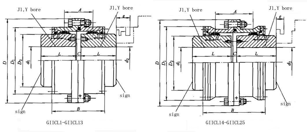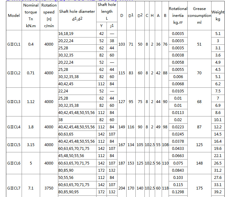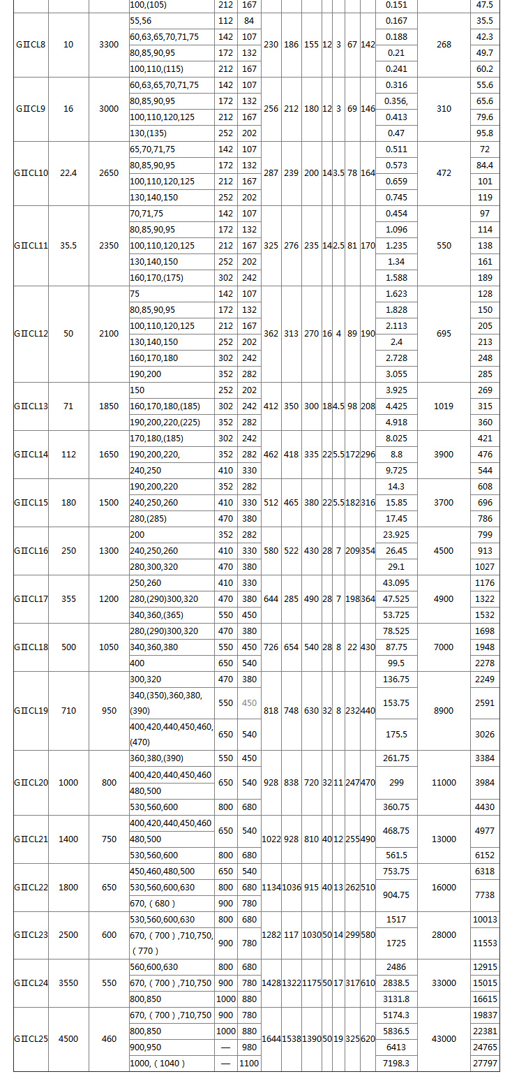 Features and applications: With a small amount of axis offset compensation performance, can not buffer, reduce vibration. The outer shape is small, theoretically, the transmission torque is large, and it needs lubrication and sealing, but the noise is large and the price is expensive, and it is used for connecting the horizontal two coaxial line shaft transmission. It is used to connect two horizontal coaxial lines under low speed and heavy load conditions, such as metallurgical machinery and heavy machinery. It is not suitable for high-speed, high-precision shafting transmission. It is not suitable to use frequent starting and reverse rotation. WG type - basic type; WGP type - with brake disc type, suitable for matching with disc brakes; WGZ type - with brake wheel type, suitable for supporting with tile brakes; WGT type - connected to the middle sleeve type, suitable for two-axis long-distance connection, the allowable speed [n] depends on the length and quality of the intermediate sleeve, and the critical speed should be checked; WGC type - vertical installation type, used to connect vertical two-axis shaft drive; Type I--The sealed end cap is of separate type with large tooth spacing, which can allow large radial displacement and can be connected with Y, J1 and Z1 shaft extensions; Type II--The sealed end cover is integral, the tooth spacing is small, the relative radial displacement is relatively small, the structure is compact, the moment of inertia is small, and it can be connected with the Y and J1 type shaft extension; GICL type - basic type (wide type); GIICL type - basic type (narrow type); GICLZ type - intermediate shaft type (wide type); GIICLZ type - intermediate shaft type (narrow type); GICL, GIICL type, for direct connection between two shaft ends; GICLZ, GILZ type, for two-axis long-distance connection; GCLD type--motor shaft extension type, used for motor shaft extension connection; ![]() ![]() ![]() |