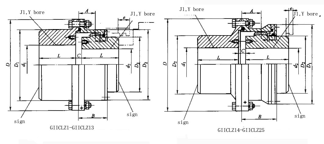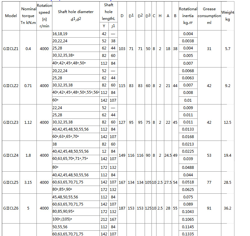 Features and applications: With a small amount of axis offset compensation performance, can not buffer, reduce vibration. The outer shape is small, theoretically, the transmission torque is large, and it needs lubrication and sealing, but the noise is large and the price is expensive, and it is used for connecting the horizontal two coaxial line shaft transmission. It is used to connect two horizontal coaxial lines under low speed and heavy load conditions, such as metallurgical machinery and heavy machinery. It is not suitable for high-speed, high-precision shafting transmission. It is not suitable to use frequent starting and reverse rotation. GICL type - basic type (wide type); GIICL type - basic type (narrow type); GICLZ type - intermediate shaft type (wide type); GIICLZ type - intermediate shaft type (narrow type); GICL, GIICL type, for direct connection between two shaft ends; GICLZ, GILZ type, for two-axis long-distance connection; GCLD type--motor shaft extension type, used for motor shaft extension connection; ![]() ![]() ![]() |