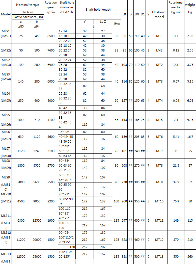 MLS (LMS) plum elastic coupling features and applications: with compensation for the relative offset of the two axes, vibration damping, cushioning performance, small radial size, simple structure, no lubrication, high bearing capacity, maintenance, replacement flexibility The components need to move axially (except MLS type), which is suitable for connecting coaxial lines, frequent starting, positive and negative rotation changes, medium and medium torque transmission shafting and working parts with high reliability. It is not suitable for heavy-duty, low-speed and axial dimensions. It is difficult to replace the two components after the elastic components are replaced.