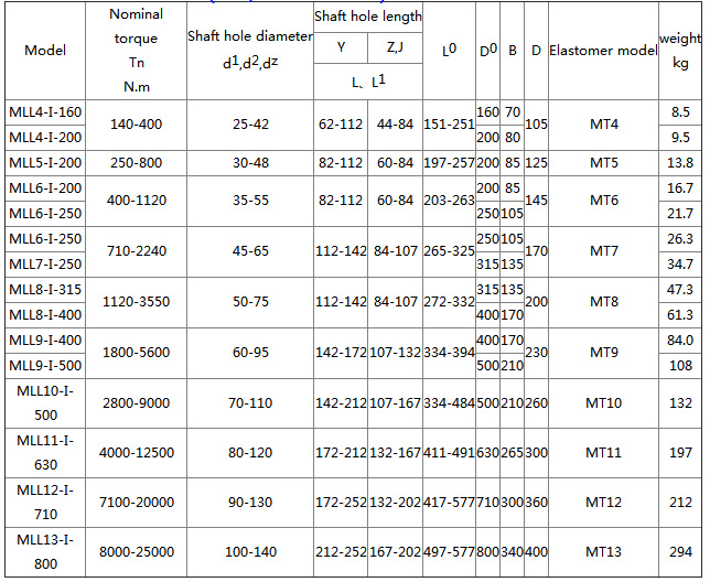 MLL-I (LMZ-I) plum couplings features and applications: with compensation for the relative offset of the two axes, vibration damping, cushioning performance, small radial size, simple structure, no lubrication, high bearing capacity, maintenance The elastic element needs to be moved axially (except for the MLS type). It is suitable for connecting coaxial lines, frequent starting, positive and negative rotation changes, medium and medium torque transmission shafting and working parts with high reliability. It is not suitable for heavy-duty, low-speed and axial dimensions. It is difficult to replace the two components after the elastic components are replaced.