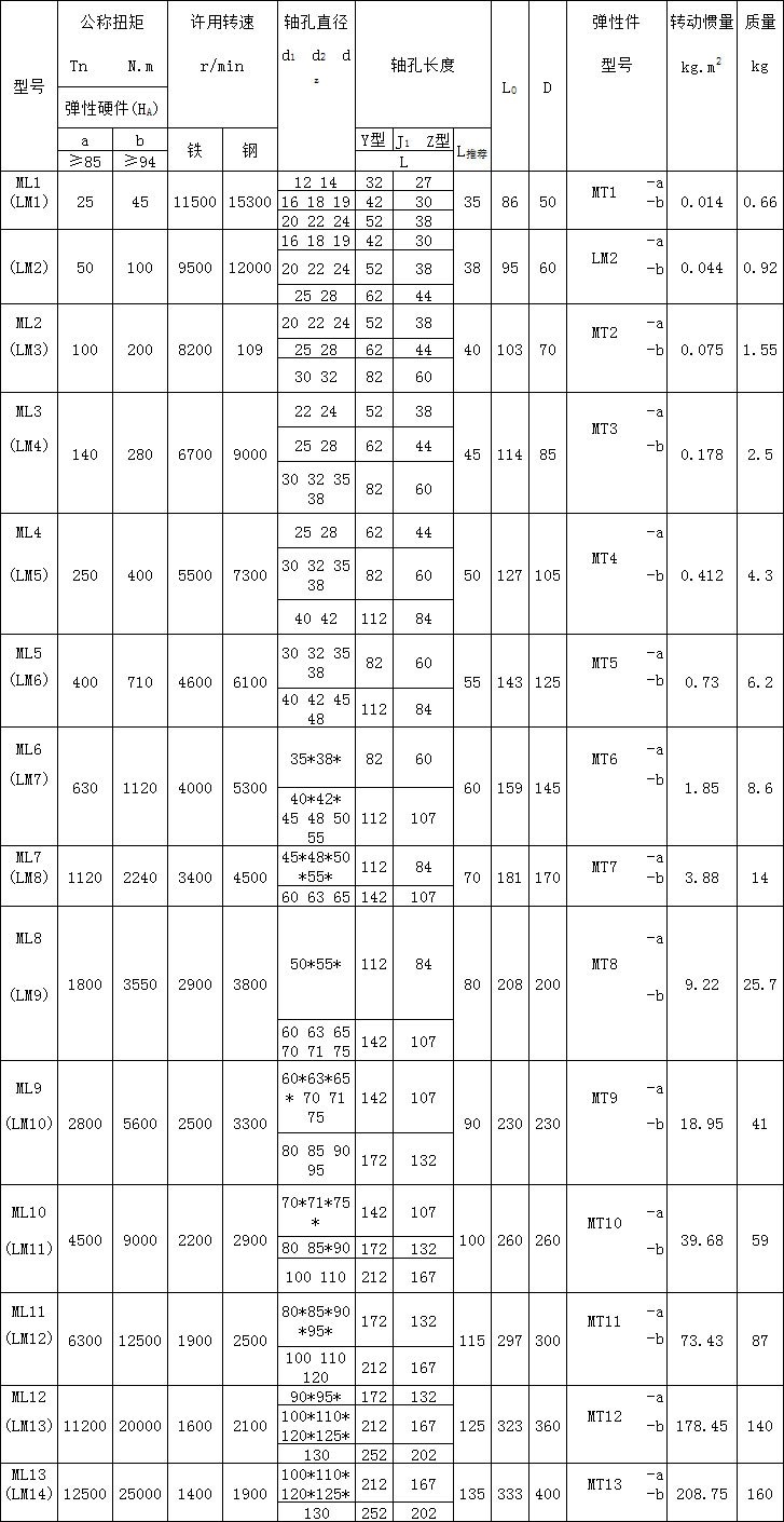 ML(LM)型梅花形彈性聯(lián)軸器的參數及主要尺寸:(GB/T 5272-2002) mm